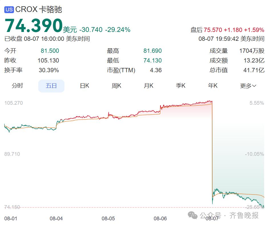 受此影响,Crocs股价一夜之间暴跌近30%,报收74.39美元,触及近三年来的最低点,也是其近十多年来最大单日股价跌幅。总市值仅剩41.71亿美元。