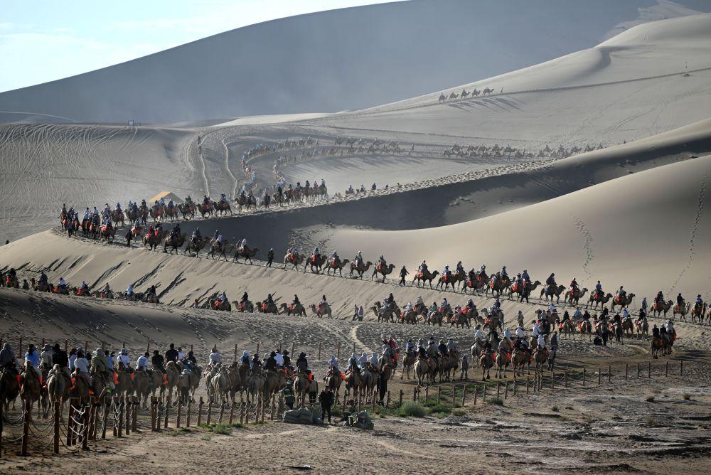8月9日,游客在甘肃省敦煌市鸣沙山月牙泉景区游览。新华社发(张晓亮摄)