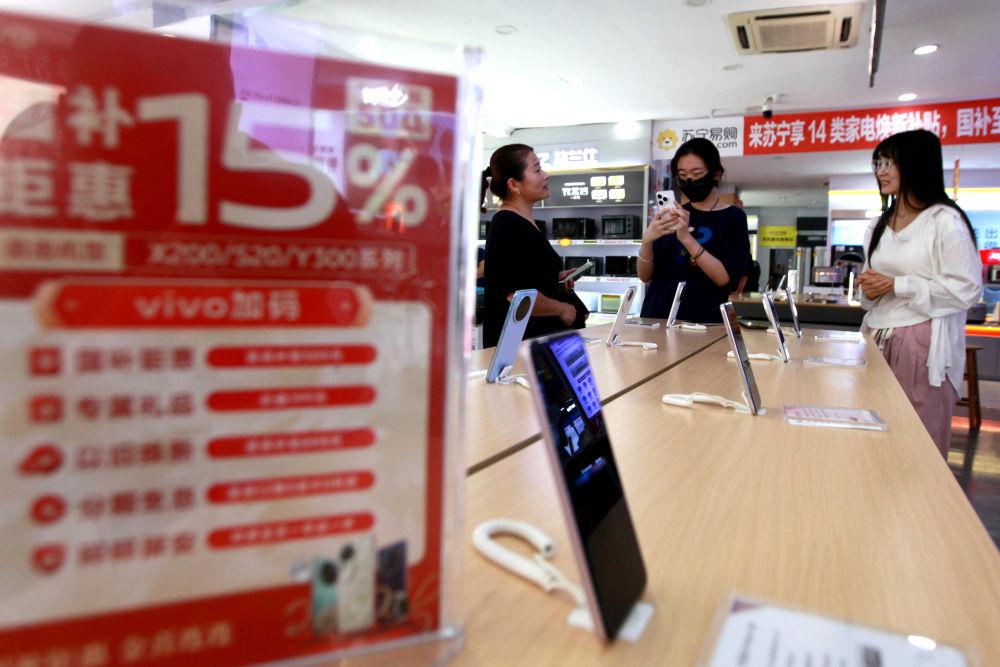 8月9日,消费者在山东省临沂市平邑县一家手机专卖店选购手机。新华社发(武纪全摄)