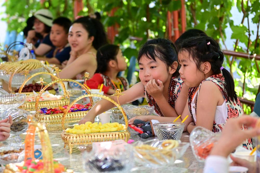 游客在新疆伊犁哈萨克自治州伊宁市伊犁老城喀赞其文化旅游区家访点品尝当地美食(7月23日摄)。新华社记者 丁磊 摄