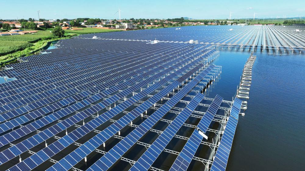7月30日在铁岭县大青水库拍摄的光伏发电板(无人机照片)。新华社记者 杨青 摄