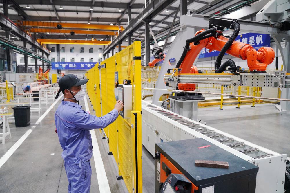 在哈尔滨电机厂有限责任公司线圈分厂智能制造车间,技术人员操作智能数控设备进行生产作业(7月24日摄)。新华社记者 王松 摄
