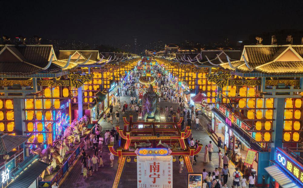 8月9日,在广西南宁市“南宁之夜”街区,游客逛夜市(无人机照片)。新华社发(蒋克青摄)
