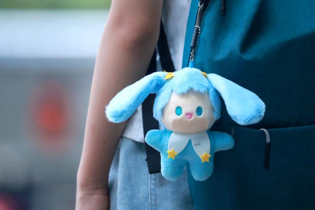 8月9日,在四川省泸州市纳溪区永宁街道,一小女孩书包上挂着挂件。新华社发(廖胜春摄)