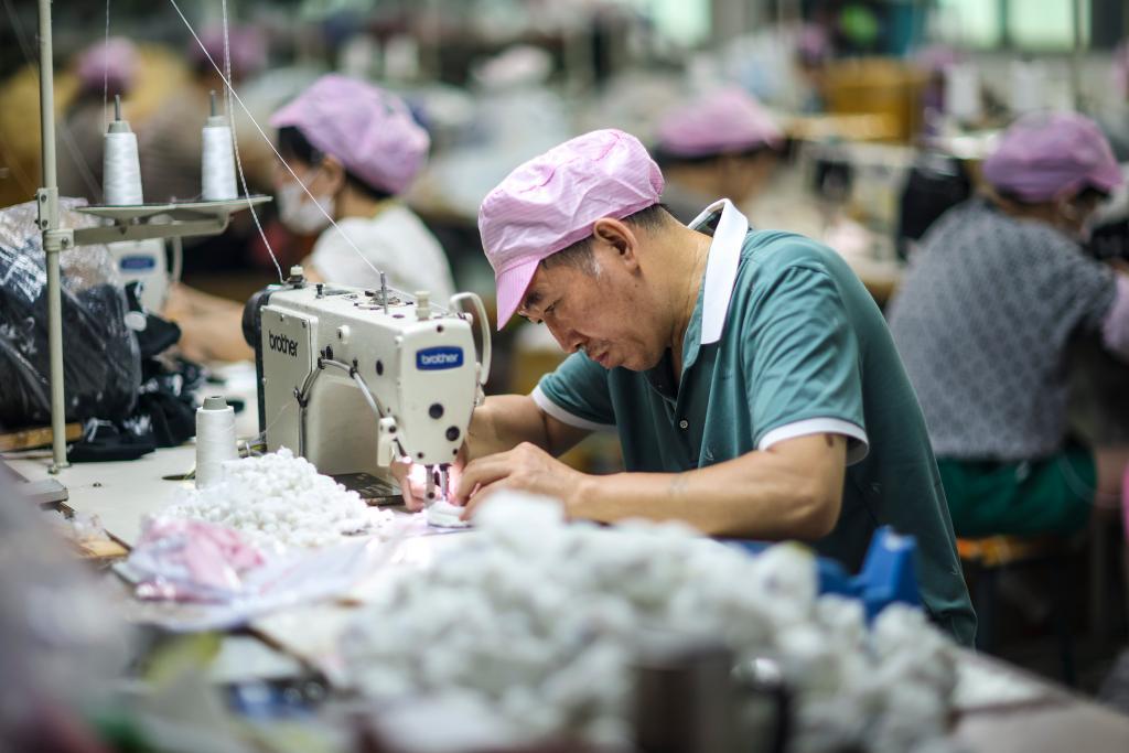 8月11日,在广东东莞奇骏玩具工厂,工人根据图纸车缝布料。新华社发(郑家雄摄)