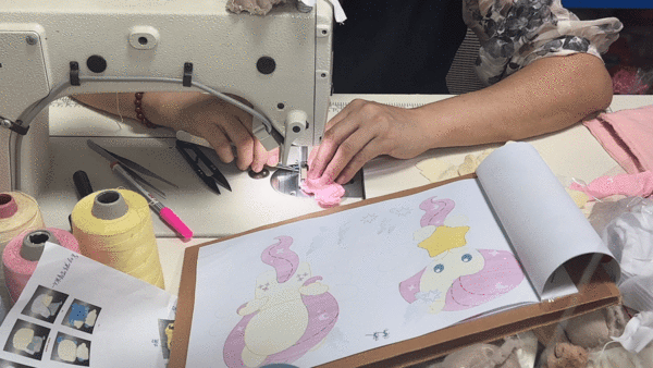 8月11日,在广东东莞奇骏玩具工厂,工人根据图纸缝制包挂部件。新华社发(郑家雄摄)