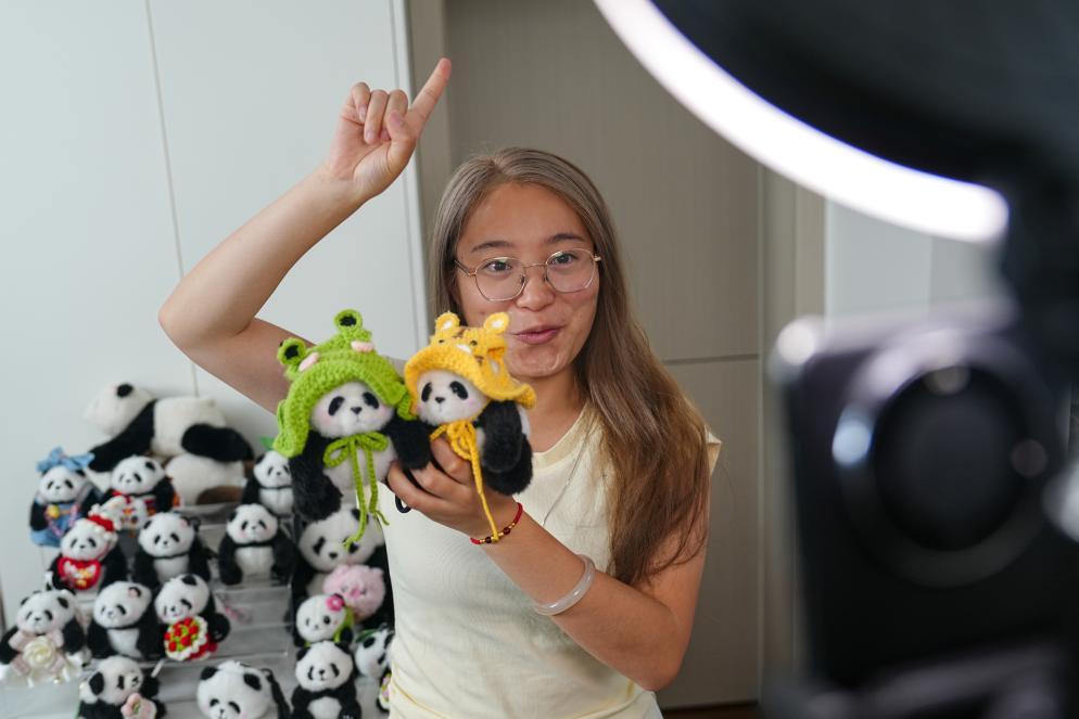 8月10日,在位于成都市武侯区的四川熊猫滚滚科技有限公司直播间,主播直播销售“大熊猫IP”包挂产品。据统计,今年1-7月,该公司包挂产品销售额达到1200万元。新华社发(翁光建摄)