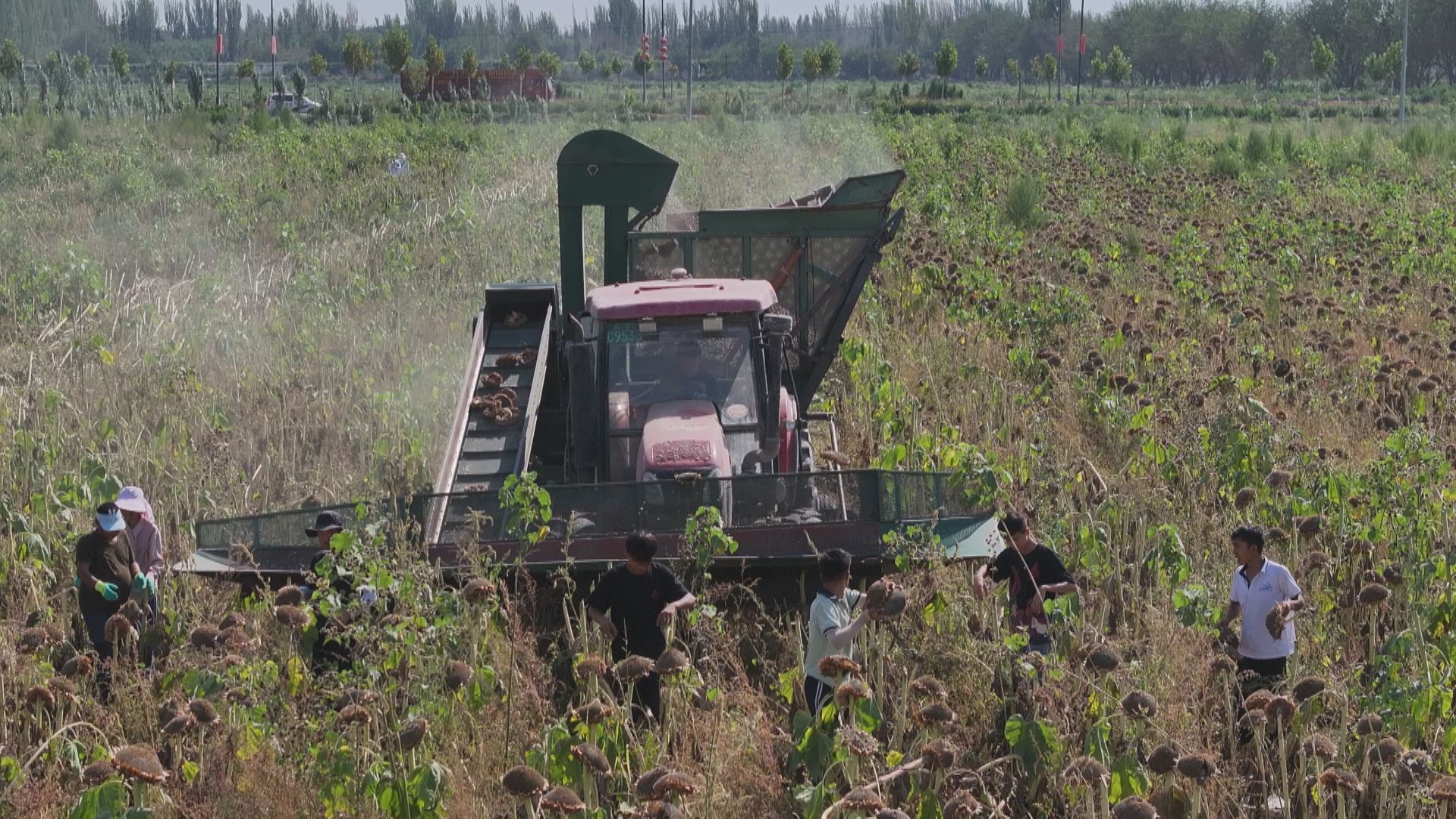 8月13日,在伊西哈拉镇食葵种植基地,数台脱粒机开足马力来回运转。农户将收割好的葵花盘有序送入进料口,机器通过碾压、分离等工序,再经分级筛选后打包外运,实现高效采收。