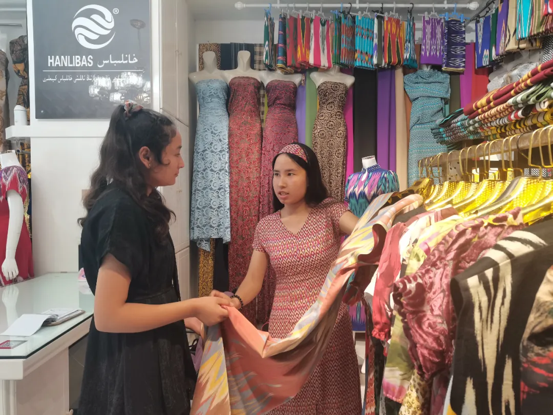8月12日,在新疆泽普县汗丽巴丝服装店内,裁缝师傅美合热阿依·麦麦提正忙着为顾客介绍艾德莱斯绸、量体裁衣。她手持软尺,仔细地为顾客测量肩宽、腰围等尺寸,不放过任何一个细节。