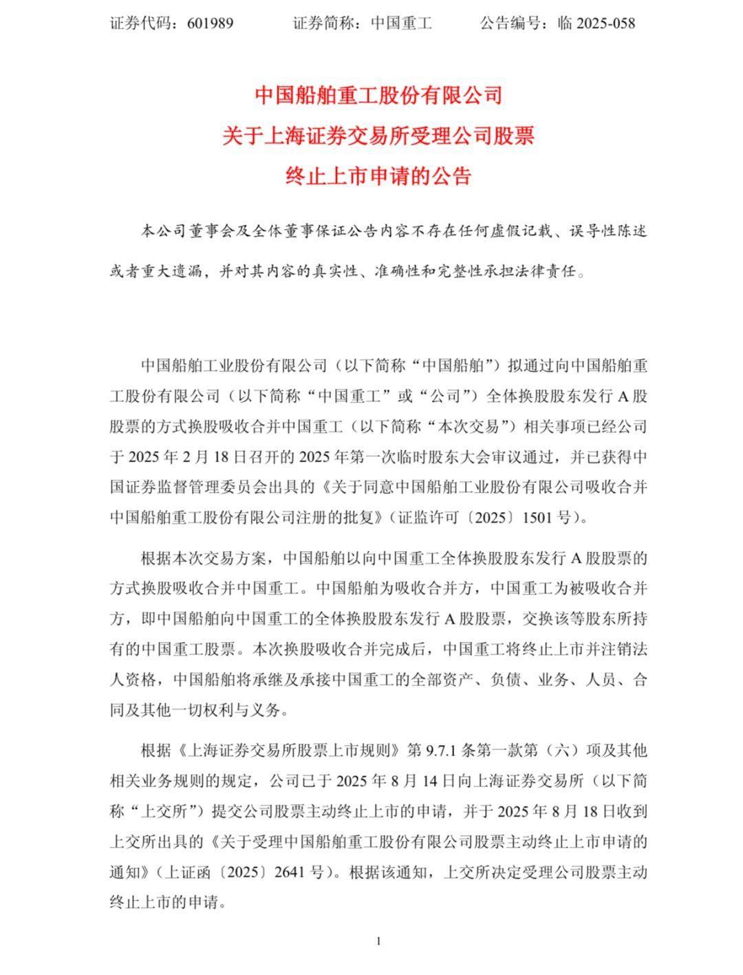 同日,中国重工(601989.SH)公告称,公司已于2025年8月14日向上海证券交易所提交股票主动终止上市的申请,并于8月18日收到上交所出具的《关于受理中国船舶重工股份有限公司股票主动终止上市申请的通知》。根据通知,上交所决定受理公司股票主动终止上市的申请。公司将在上交所批准后刊登相关终止上市公告。