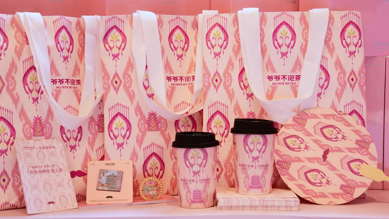 除了产品研发,文创周边也是爷爷不泡茶继承和创新非遗的重要板块。此次参展,爷爷不泡茶邀请了“新疆维吾尔族艾德莱斯绸织染技艺”自治区级非遗代表性传承人麦麦提艾力携手共创,巧妙融合荆楚文化与新疆非遗技艺,制作新疆限定文创,以一杯蕴含东方韵味的香茶为媒介,跨越超5000公里,开启一场从图案设计到味觉体验的非遗共振。