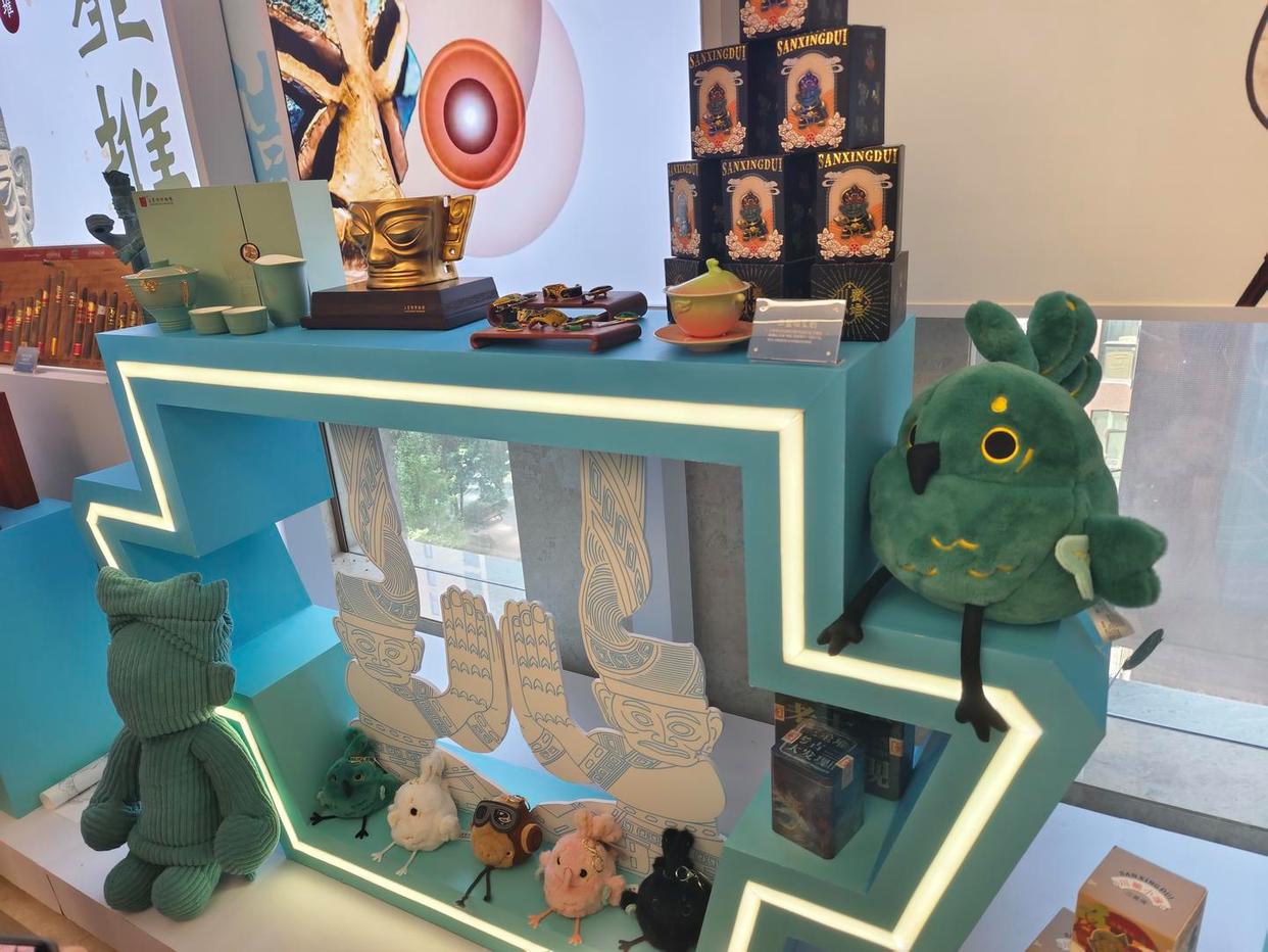 此外,跨界合作更让三星堆IP“破圈”:与游戏《原神》联名曝光量超15亿;与科技、金融、文艺领域的融合创新,年授权收入超千万元。线下场景同样丰富,博物馆内6个沉浸式文创馆兼具购物与文化体验功能,“堆堆咖啡茶饮”“主题邮局”让文物元素融入日常,主题航班、动车更让旅程满是历史韵味。