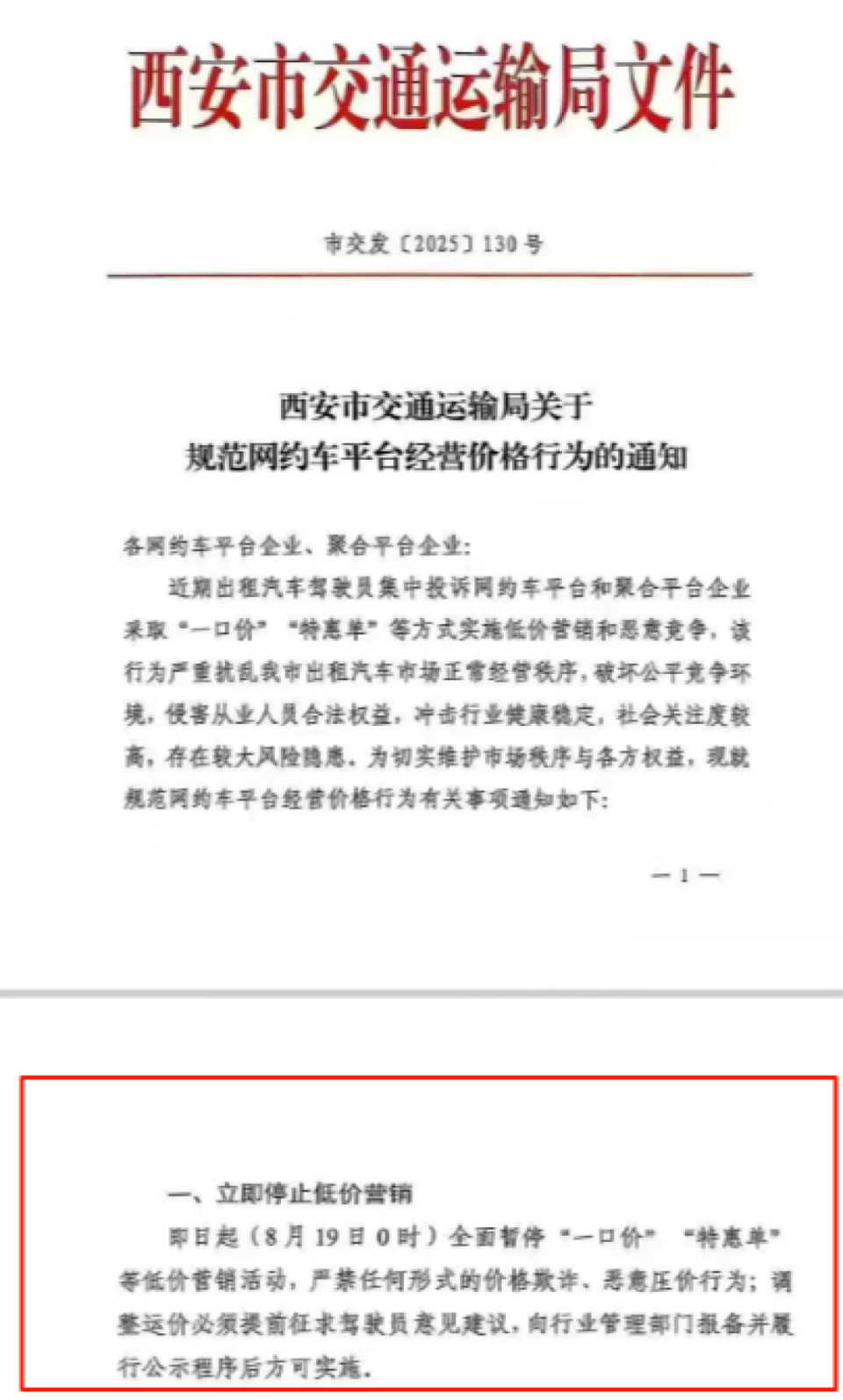 近日,一份《西安市交通运输局关于规范网约车平台经营价格行为的通知》引发关注,红星新闻从西安市交通运输局处确认通知属实。通知要求,从8月19日零时起,全面暂停“一口价”“特惠单”等低价营销活动,严禁任何形式的价格欺诈、恶意压价行为等。