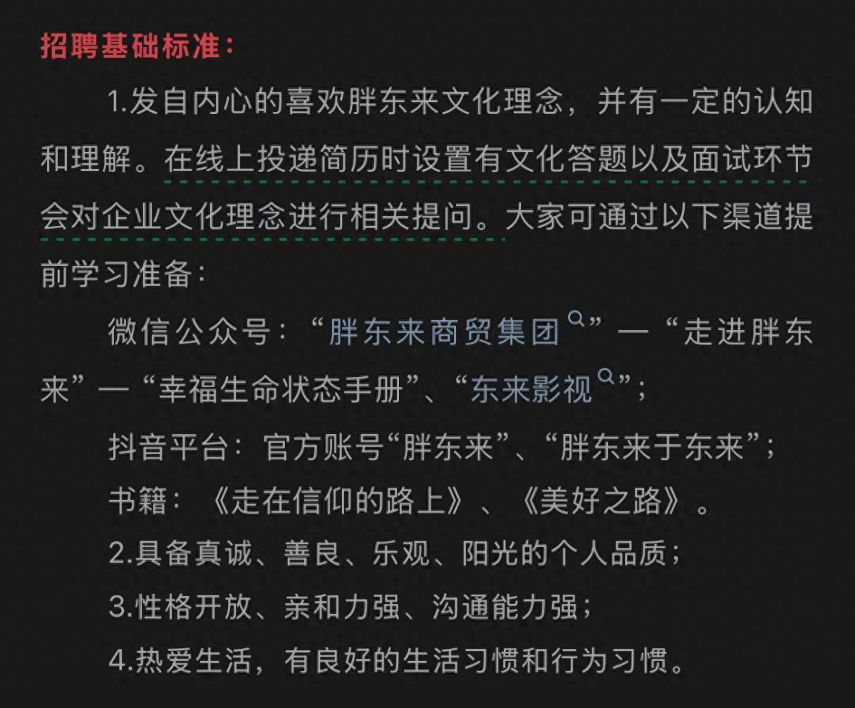 8月18日,一则“胖东来招聘”的信息登上热搜,一则招聘公告10万+的阅读量。此次招聘中,胖东来不仅为在新疆、西藏高原艰苦地区奉献的退伍边防军人和刑释人员开设专属通道,分别招录200人和20人,保安、保洁的月薪更是近9000元。从招聘要求上看,“发自内心地喜欢胖东来的文化理念”和“个人品质”作为了基础标准。网友感慨:“它甚至怕你不知道怎么准备,连书都列上了,真诚做到了极致。”