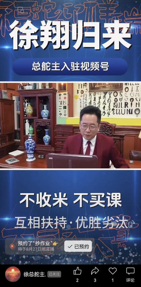 在视频号上,一个名为“徐总舵主”的账号,发布徐翔归来,总舵主入驻视频号的内容,虽然标出“不收米(钱),不买课,相互扶持,优胜劣汰”的字样,但视频下方打出8月27日前直播的链接,邀请网友预约直播。