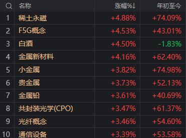 板块方面,稀土永磁、白酒、CPO、通信设备等板块涨幅居前,美容护理等少数板块下跌。