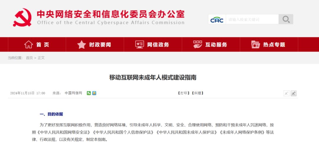 去年11月,国家互联网信息办公室发布了《移动互联网未成年人模式建设指南》,提出未成年人模式建设的整体方案,鼓励和支持移动智能终端、应用程序和应用程序分发平台三方共同参与未成年人模式建设,将分散的功能集成化,将分段保护一体化,筑牢未成年人网络保护的“三重防线”。