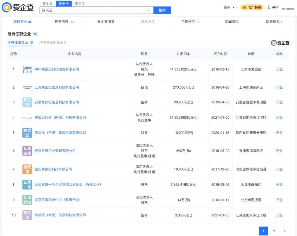 爱企查App显示,陈天石名下关联19家企业,涉及科技、半导体、投资等领域,其中16家为开业状态,包括中科寒武纪科技股份有限公司、上海寒武纪信息科技有限公司、寒武纪行歌(南京)科技有限公司等。在上述为开业状态的企业中,陈天石担任法定代表人、董事长、执行董事等职务。
