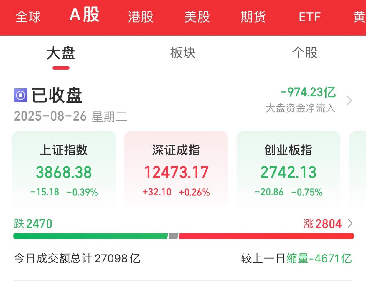 红星资本局8月26日消息,A股三大指数今日涨跌不一,截至收盘,沪指跌0.39%,深证成指涨0.26%,创业板指跌0.75%,北证50跌0.76%。沪深京三市全天成交额27098亿元,较上日缩量4671亿元。全市场超2800只个股上涨。