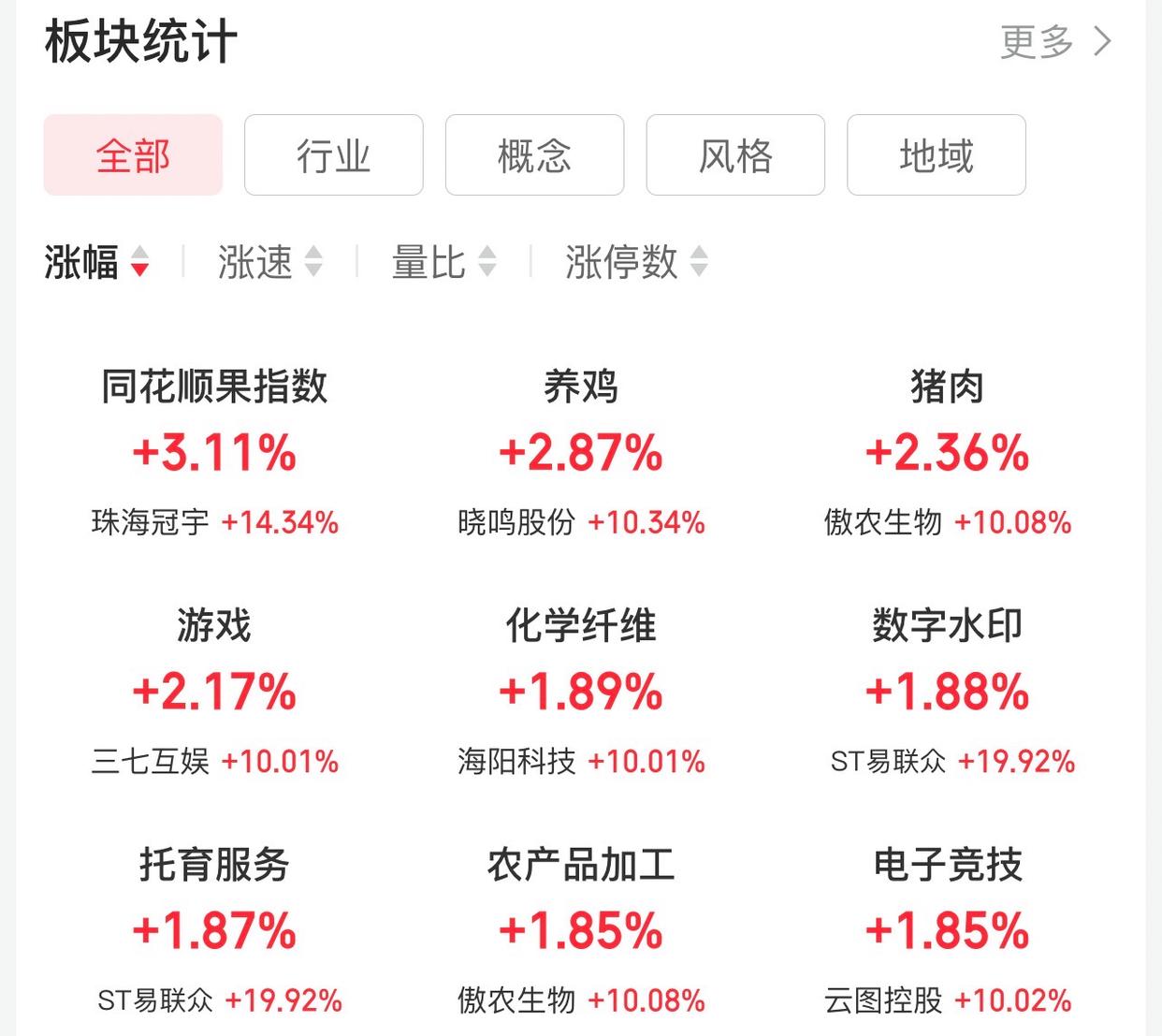 板块题材上,猪肉、游戏、农药、消费电子、华为概念股领涨;稀土、创新药、军工、PEEK材料、证券、机器人板块跌幅居前。