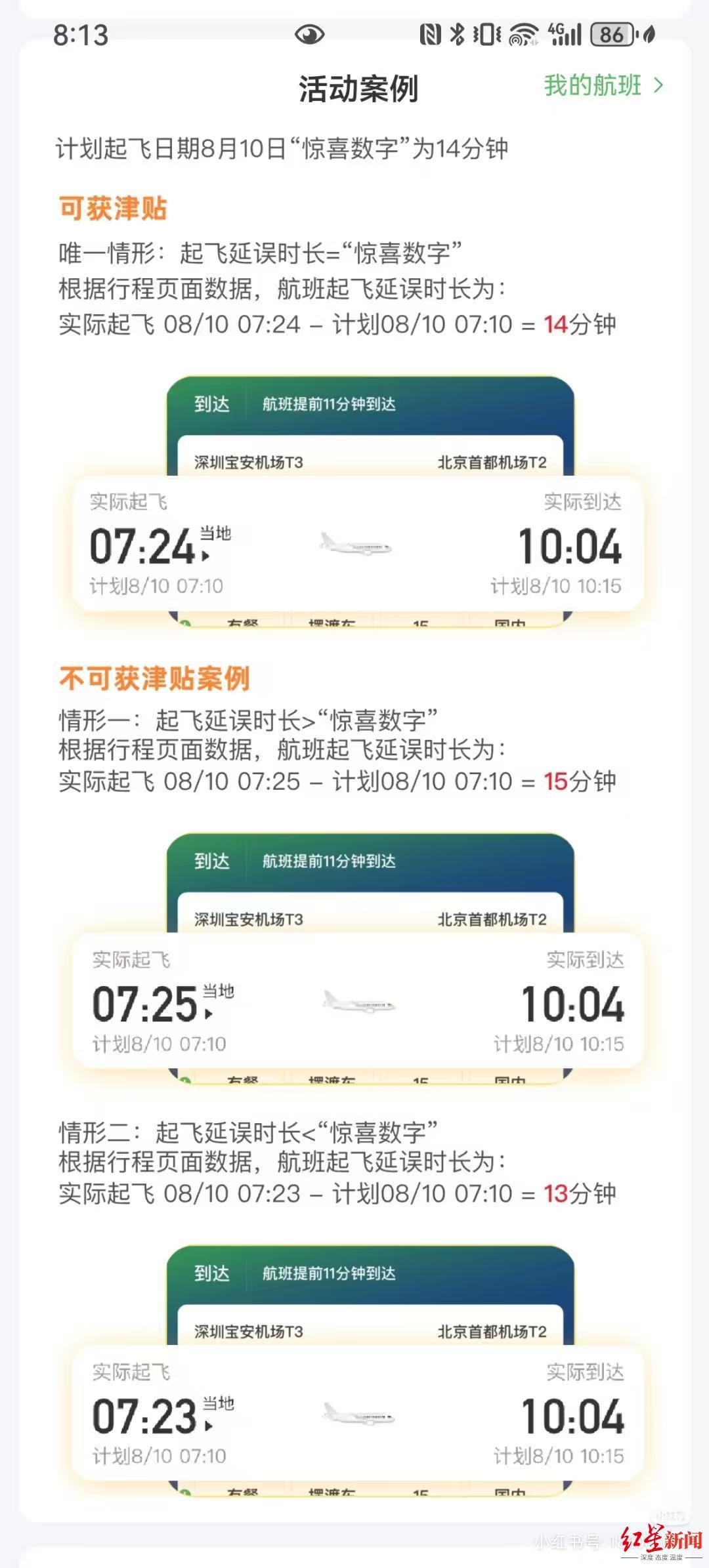 红星资本局注意到,《活动规则》中的“活动案例”显示,可获津贴的唯一情形为:“起飞延误时长=惊喜数字”;不可获津贴案例包括“起飞延误时长>惊喜数字”和“起飞延误时长<惊喜数字”。据界面新闻报道,目前,9.9元“惊喜数字”活动仅向部分旅客、部分航线、部分机场开放。