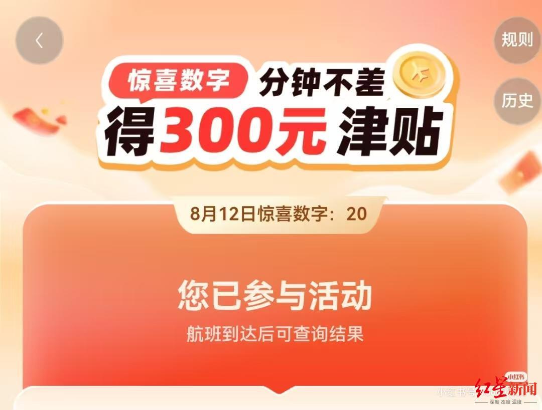 一位消费者王女士也证实,目前9.9元“惊喜数字”活动已经停止。王女士表示,她曾经参与过“惊喜数字”活动,并且延误时长刚好符合,顺利得到了300元津贴。近日王女士在航旅纵横上有新的待出发行程,前几天行程页面上还可以看到9.9元“惊喜数字”活动页面,今天看行程信息时发现已经没有该活动了。