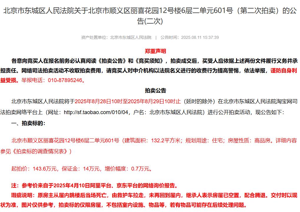 近日,位于北京市顺义区丽喜花园的一套商品房因公告其主人跳楼身亡后,该房产被法拍时标注这一情况被称为“死亡备注”而广受关注。8月28日,扬子晚报紫牛新闻记者从阿里资产拍卖平台上获悉,北京市东城区人民法院将于8月28日10时至2025年8月29日10时止(延时的除外)对该套房产在该院淘宝网司法拍卖网络平台上进行公开拍卖活动,起拍价为143.6万元。记者获悉,这也是该套房产第二次网上拍卖,且较第一次拍卖降价36万元。截至记者发稿时为止,仅有1人报名参拍,另有近万人围观。