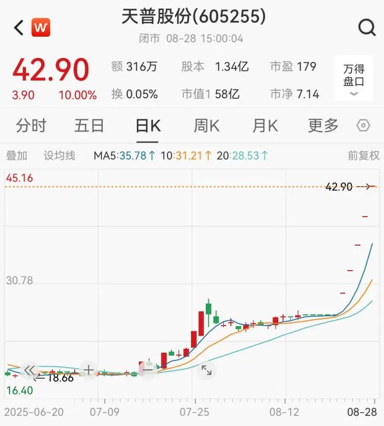 与此同时,天普股份股价自8月22日复牌后连续5个交易日涨停,累计涨幅超61%,显著偏离同期大盘及行业指数。公司同步发布风险提示称,当前股价已严重脱离基本面,市盈率远超行业水平,未来存在快速下跌风险。