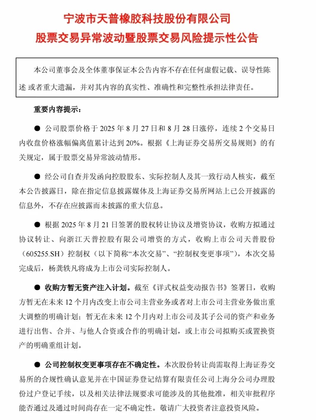 而8月22日,上交所已针对天普股份控制权转让方案发出过监管工作函,重点关注收购方资金来源、内幕信息管控等核心问题。