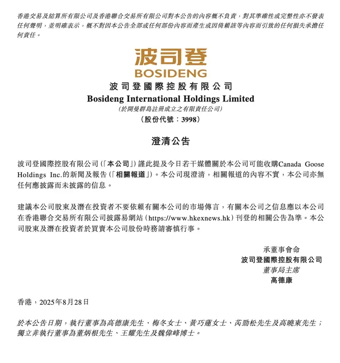 8月28日,波司登在港交所公告,公司谨此提及今日若干媒体关于本公司可能收购Canada Goose Holdings Inc.的相关报道。本公司现澄清,相关报道的内容不实,公司亦无任何应披露而未披露的信息。