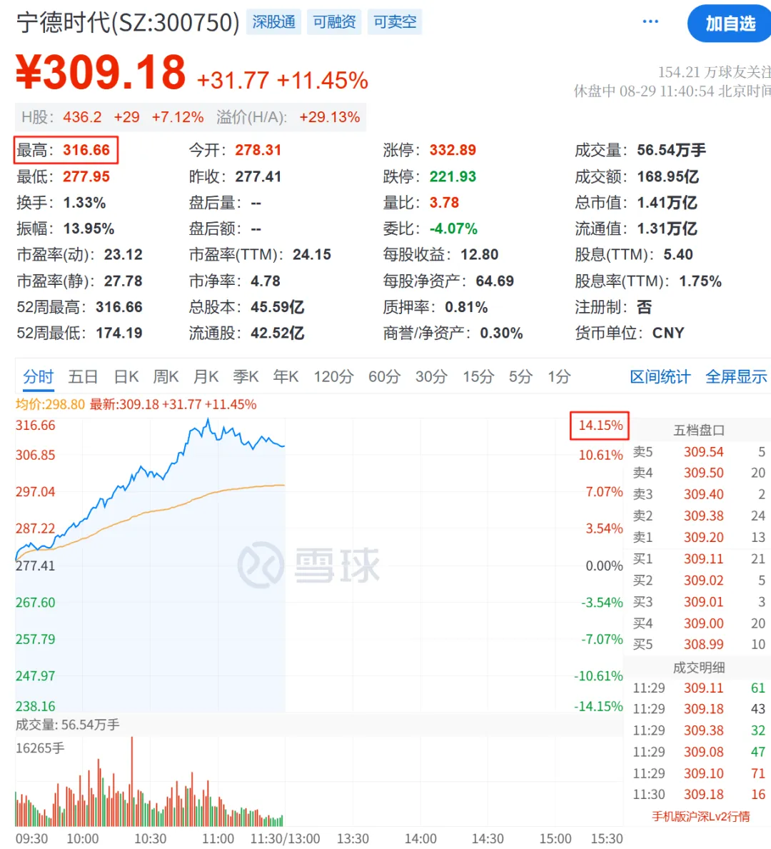 宁德时代盘中一度涨超14%,股价最高达到316.66元/股,创2022年1月以来新高。