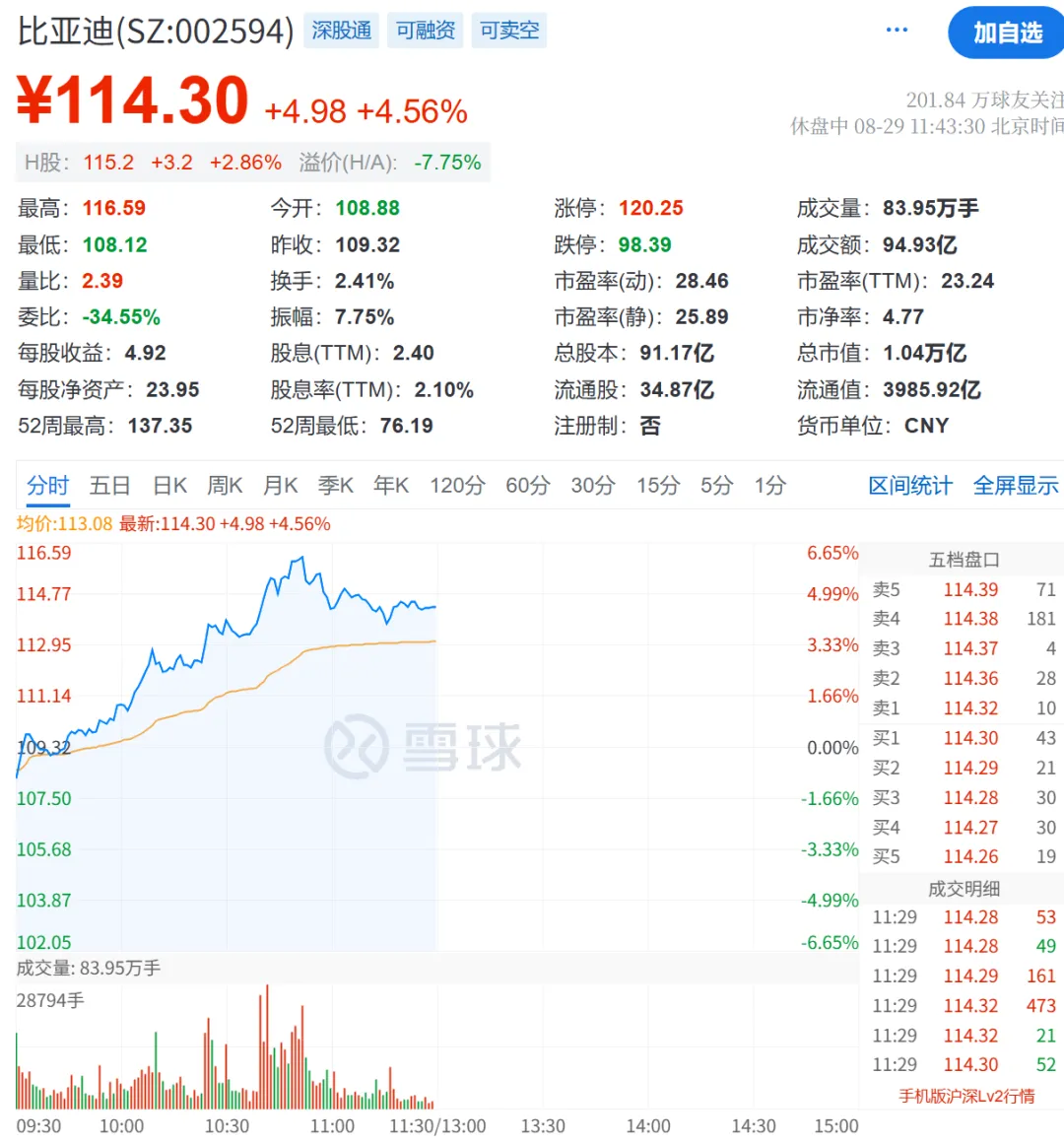 比亚迪上午亦有明显涨幅,盘中一度涨超6%。