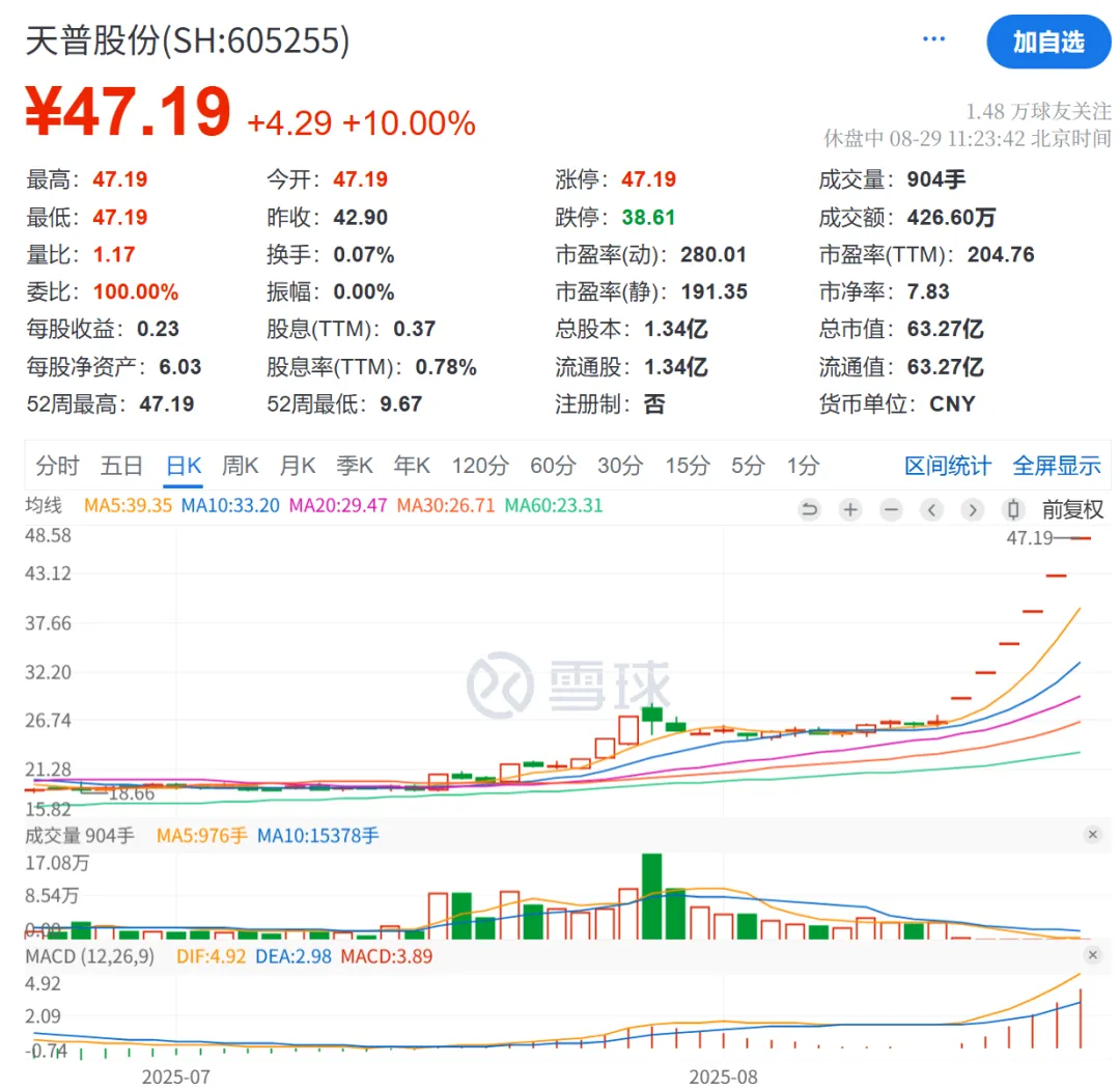 8月29日上午,天普股份开盘涨停,股价报47.19元/股,成功拿下“6连板”的战绩。