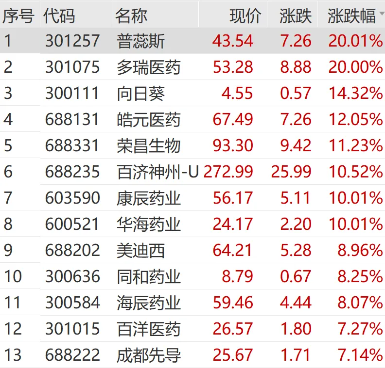 个股方面,普蕊斯、多瑞医药20cm涨停,康辰药业、华海药业封板,皓元医药、荣昌生物、百济神州涨超10%,美迪西、成都先导等跟涨。