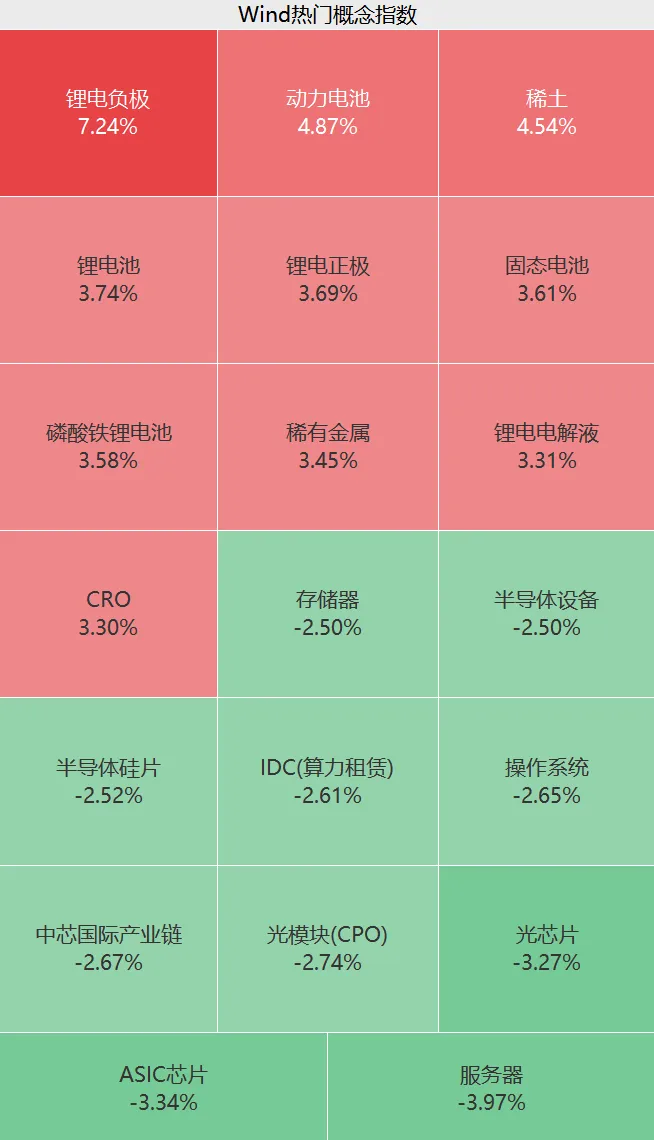 盘面上,上午锂电池产业链集体飙涨,锂电负极、稀土、固态电池等概念股活跃;芯片、半导体等板块回调,光模块、光芯片、服务器等概念股跌幅居前。