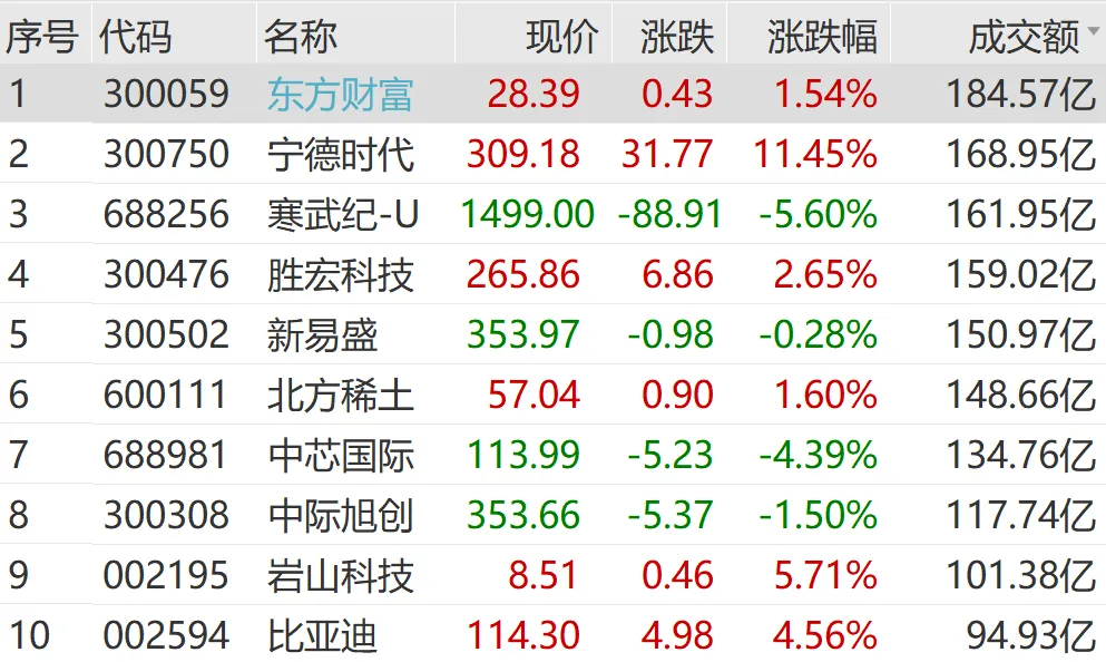个股方面,东方财富上午成交额居首,近185亿元;宁德时代、寒武纪成交额均超160亿元。胜宏科技、新易盛、北方稀土、中芯国际、中际旭创、岩山科技等成交额超100亿元。