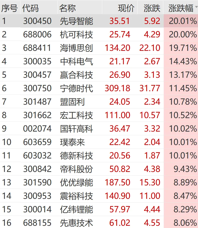 8月29日上午,A股电力设备板块走高,锂电池产业链爆发。个股方面,先导智能、杭可科技双双20cm涨停,海博思创盘中触及20cm涨停,国轩高科、璞泰来、德新科技等多股涨停。