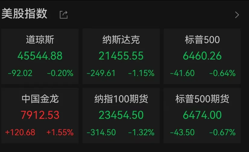 周五美股全线下挫,截至收盘,道琼斯工业平均指数下跌0.20%,至45544.88点,纳斯达克综合指数下跌1.15%,至21455.55点,标准普尔500指数下跌0.64%,收于6460.26点。