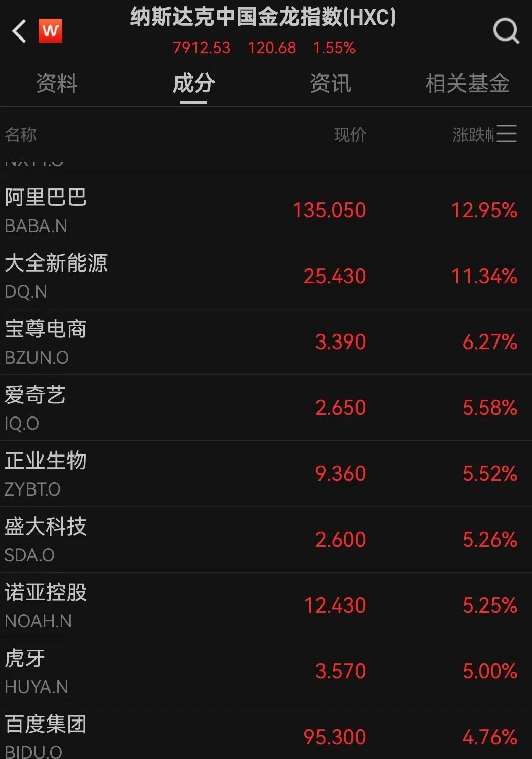 纳斯达克中国金龙指数收涨1.5%,阿里巴巴涨12.9%,创2023年3月以来最大涨幅,消息面上,公司高管称过去四个季度已在AI基础设施及AI产品研发上累计投入超过1000亿元。百度涨4.7%,京东涨2.2%,网易、拼多多则跌超1%。