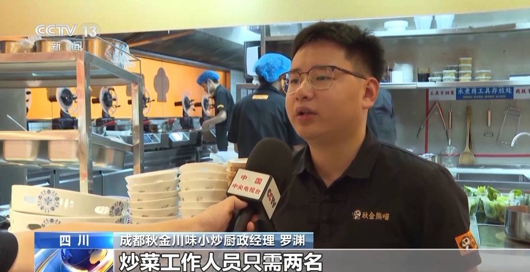 成都秋金川味小炒厨政经理罗渊:目前我们门店有8台炒菜机器人,炒菜工作人员只需两名,一名员工可以独立操作4台炒菜机器人。相较于传统厨房,炒菜岗位工作效率提升了60%以上。