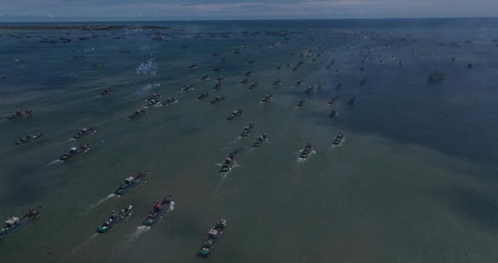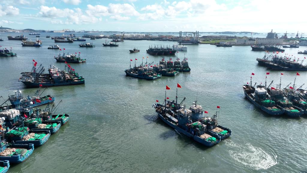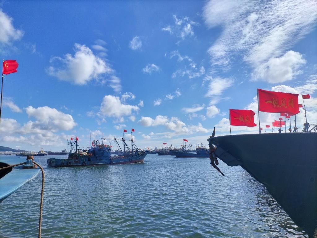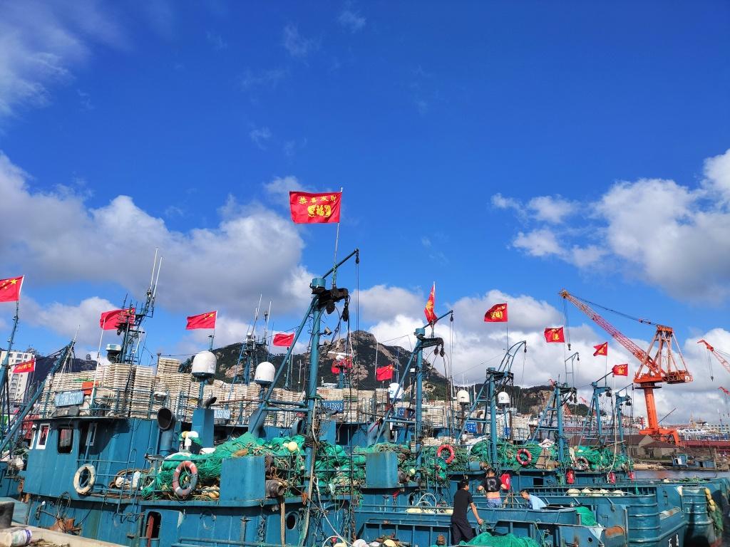 9月1日中午12时,威海石岛渔港上演千帆竞发的壮观场面