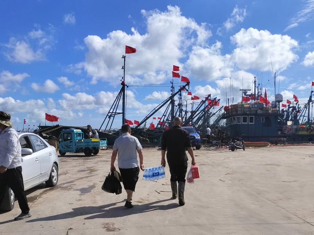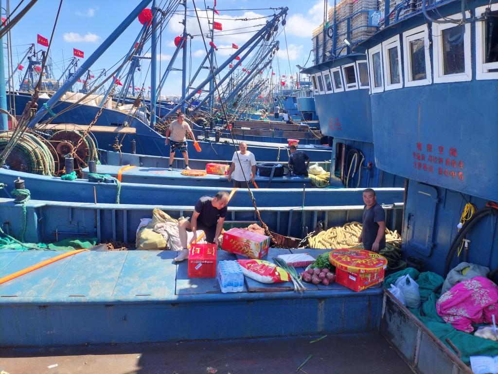 随着温度的上升,渔民忙碌的脚步并没有停下,他们几乎每个人都汗流浃背,有的干脆脱掉了上衣。“出海捕捞是个体力活,吃饭是个大问题,这些猪肉、鸡蛋、花生油、面粉、蔬菜、饮料都是我们刚买的,吃几天都没问题。”一位正从汽车上卸物资的渔民徐先生说。