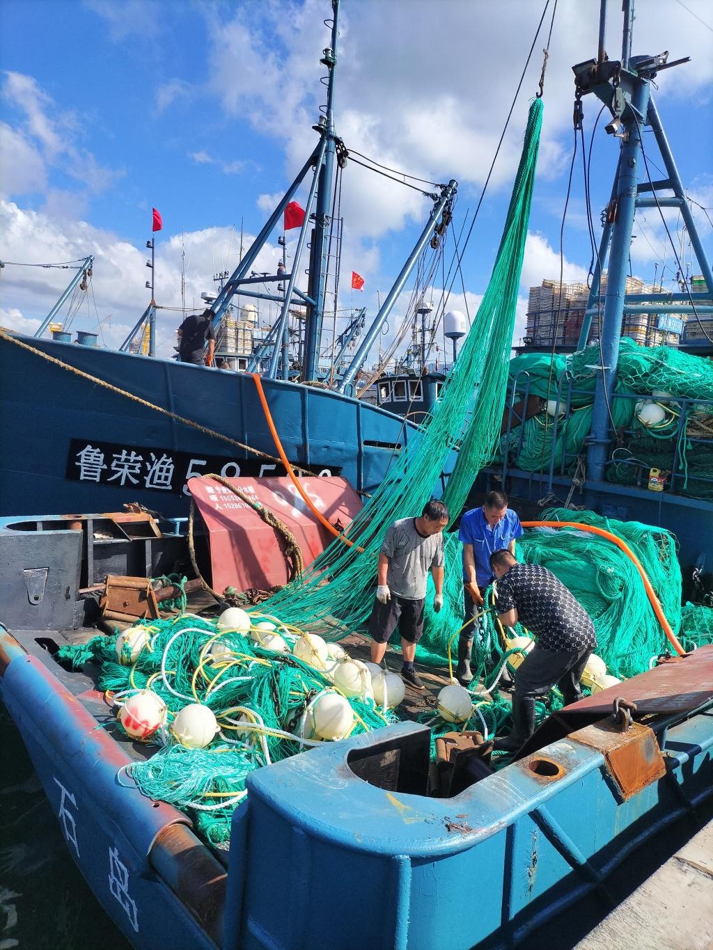 “这车冰卸到这条船上!”“这是油条和豆浆,大家忙了好一会儿先把早饭吃了再干!”9月1日早上不到八点,在石岛渔港内,不少渔民已经忙得热火朝天。半岛全媒体记者注意到,船上的渔民虽然忙碌,但是分工明确,有的在检查修补渔网,有的在往船上装生活物资,还有的忙着往船上装冰……