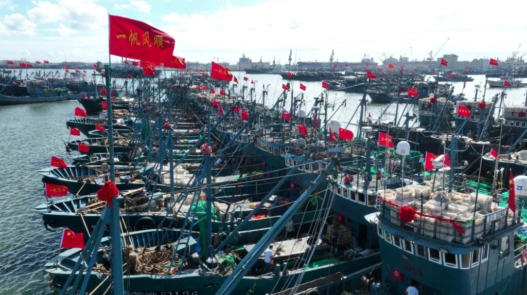 一艘艘挂着红旗的渔船奔向捕捞海域