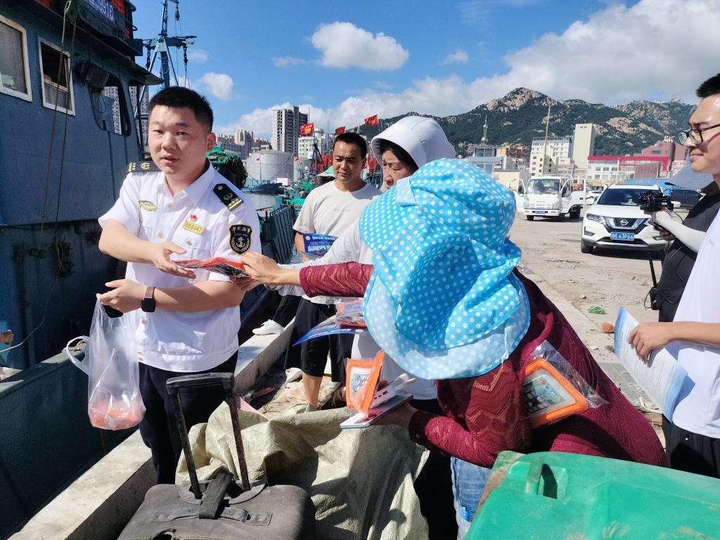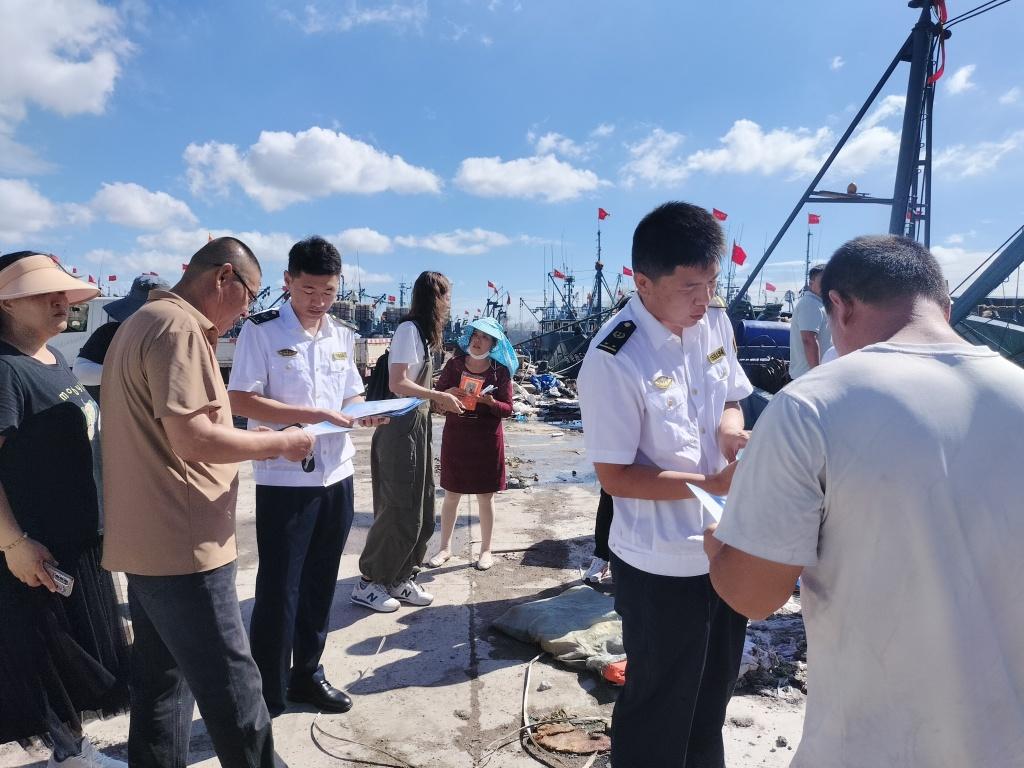 威海海事局石岛海事处工作人员在石岛渔港与渔民面对面、点对点开展安全教育。