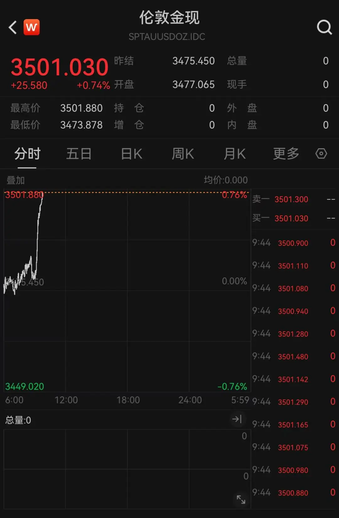 刚刚,现货黄金盘中突破3500美元,超过今年4月22日,再创历史新高。截至发稿,报3501.030美元/盎司,日内涨0.74%。
