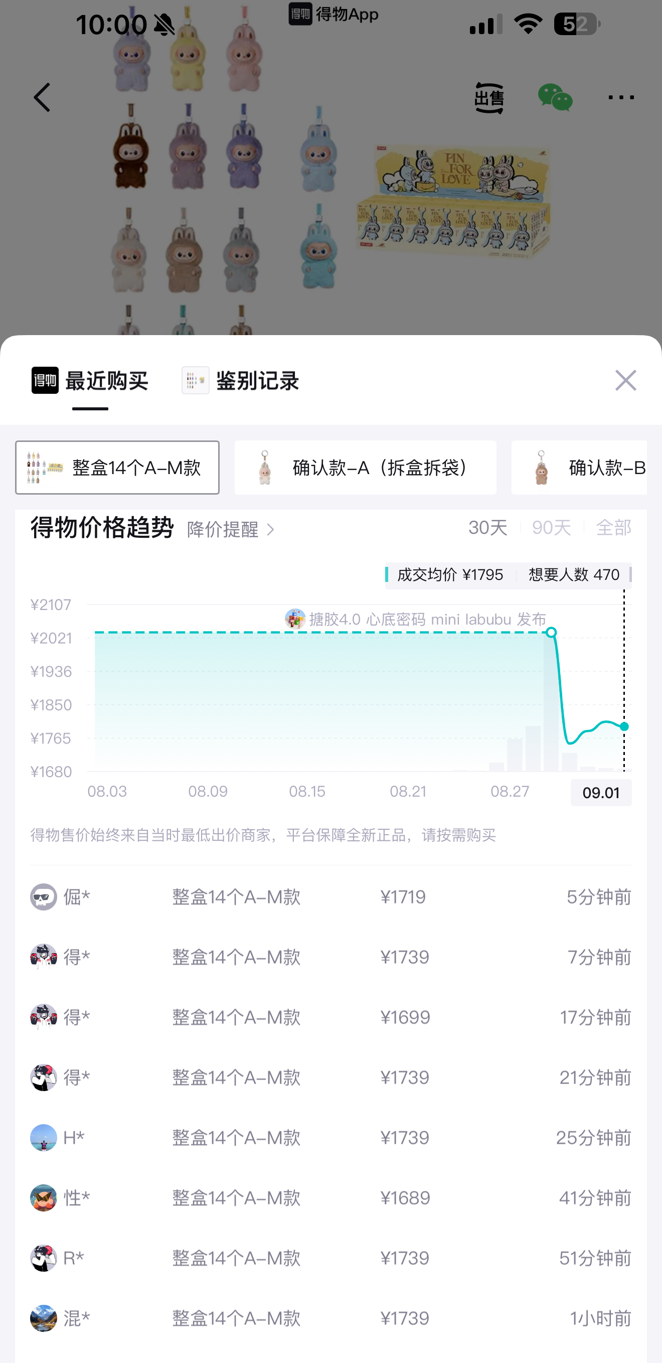 在得物上,Rock大娃也成为爆款。截至9月2日,Rock大娃在得物售出超6000个,近30天成交均价近900元,有超9.8万人表达“想要”意向。