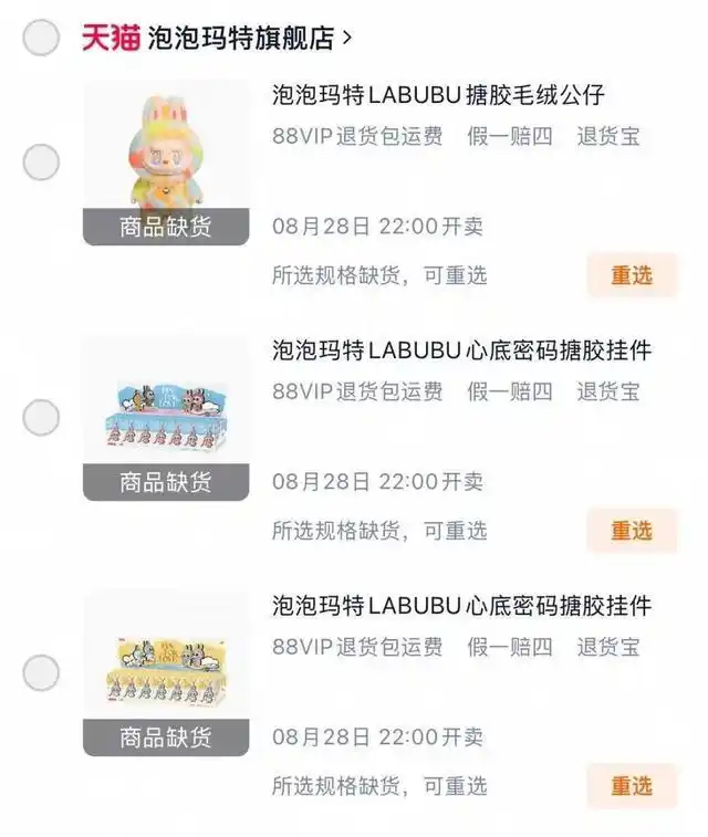 8月28日晚10点,京东、淘宝、抖音等多个平台也同步开售迷你版Labubu。开售1分钟内,多平台链接即显示为“已售罄”。天猫泡泡玛特旗舰店显示,当晚售出超30万件,相关商品均已下架;泡泡玛特抖音直播间的迷你版Labubu链接也显示“已抢光”。在潮流平台得物上,迷你版Labubu同样火爆,开售2分钟后,就在得物售出超1.3万单。