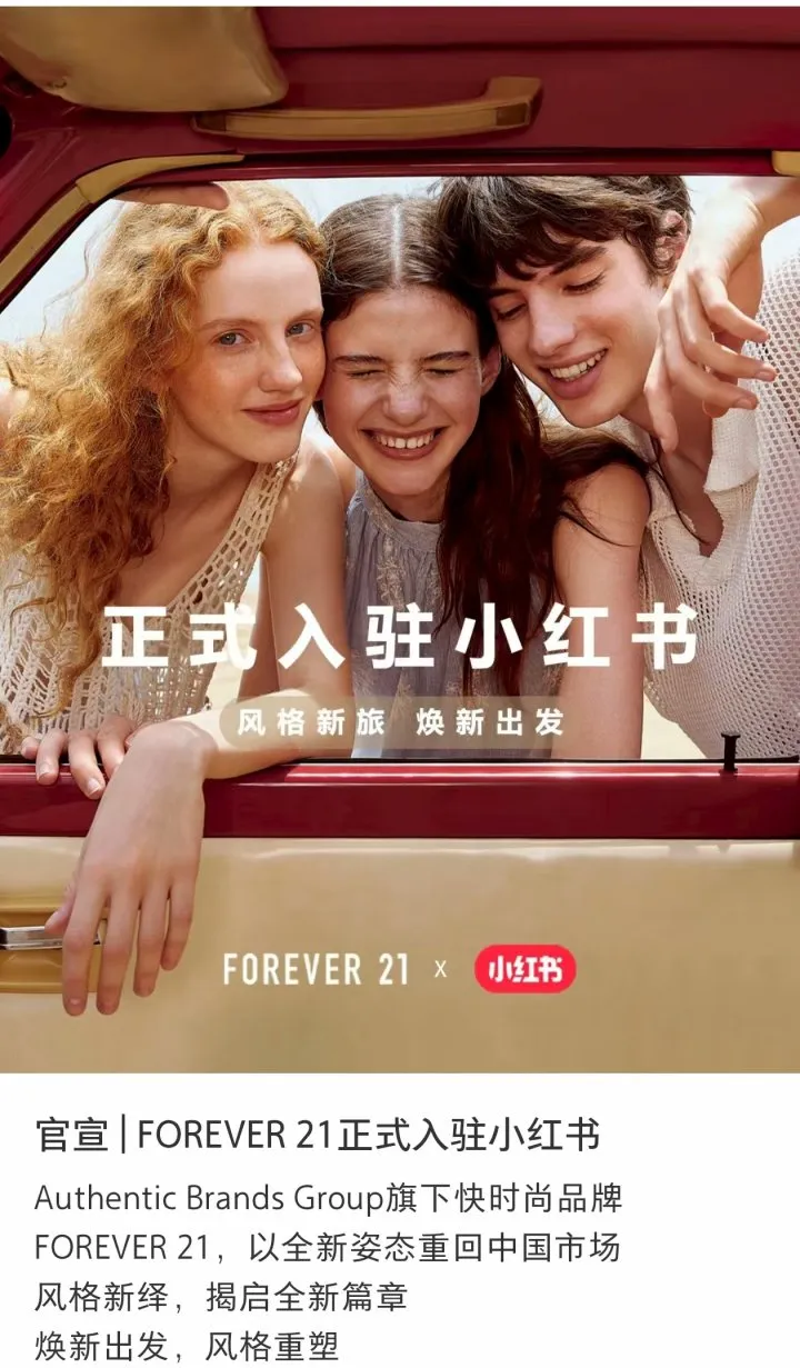 据悉,今年6月,FOREVER21母公司Authentic Brands Group(ABG)宣布与上海橙迪达成合作,全面升级中国市场业务。上海橙迪贸易有限公司成立于2015年,唯品会是其第一大股东。同时,FOREVER21官宣入驻小红书平台,在社交媒体上宣布“以全新姿态重回中国市场”。