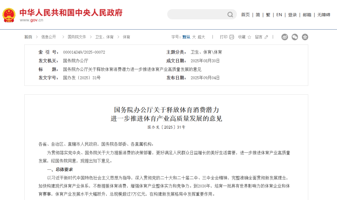 9月4日,国务院办公厅印发《关于释放体育消费潜力进一步推进体育产业高质量发展的意见》(以下简称《意见》)。《意见》明确,到2030年,培育一批具有世界影响力的体育企业和体育赛事,体育产业发展水平大幅跃升,总规模超过7万亿元,在构建新发展格局中发挥重要作用。